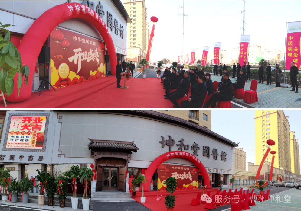 2025年1月5日(农历2024年腊月初六),曹县坤和堂国医馆门前,宾客如织、彩旗飘扬、鲜花绽放,一片祥和喜庆,备受社会各界关注的坤和堂国医馆盛大开业了!上午11时9分,伴随着热烈的掌声和欢快的乐曲,开业盛典仪式正式开始,主持人依次宣读了嘉宾和祝贺单位名单。山东坤和堂药业股份有限公司总经理袁皓首先致欢迎辞,向来宾及祝贺单位表示感谢;菏泽中医药管理局领导王体禹、山东中医药大学专家马传江分别致辞,对国医馆开业表示祝贺,并对医馆未来发展寄于厚望。随后,三位领导和菏泽市中医界名老中医代表陈允望共同为国医馆开业揭牌。