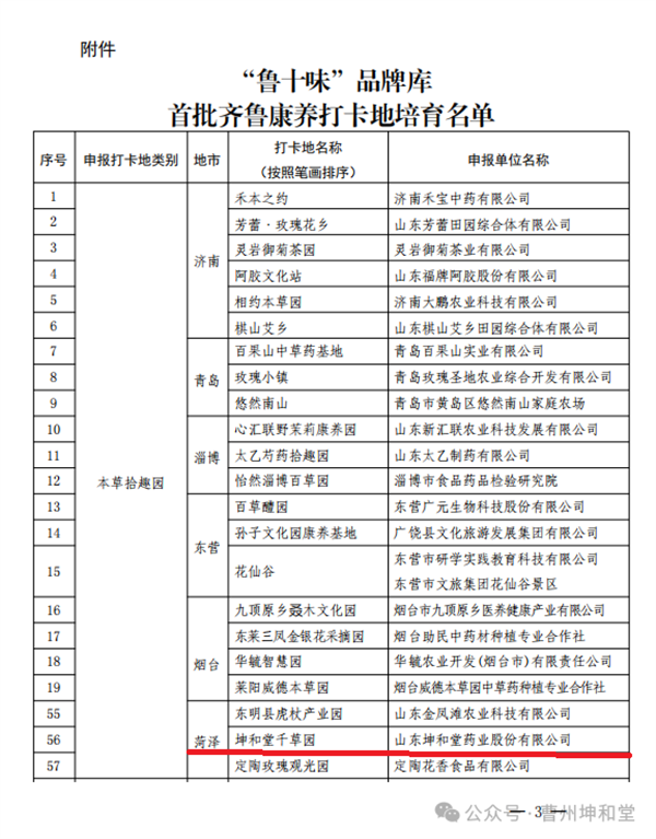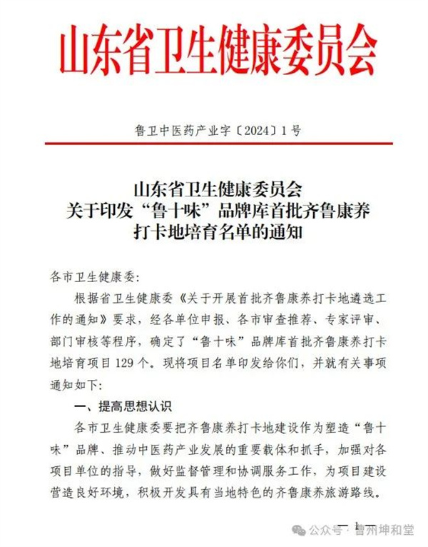 2024年2月份,山东省卫健委(鲁卫中医药产业字【2024】1号文件)发文公布了首批齐鲁康养打卡地培育名单,公司“坤和堂千草园”项目成功入选。